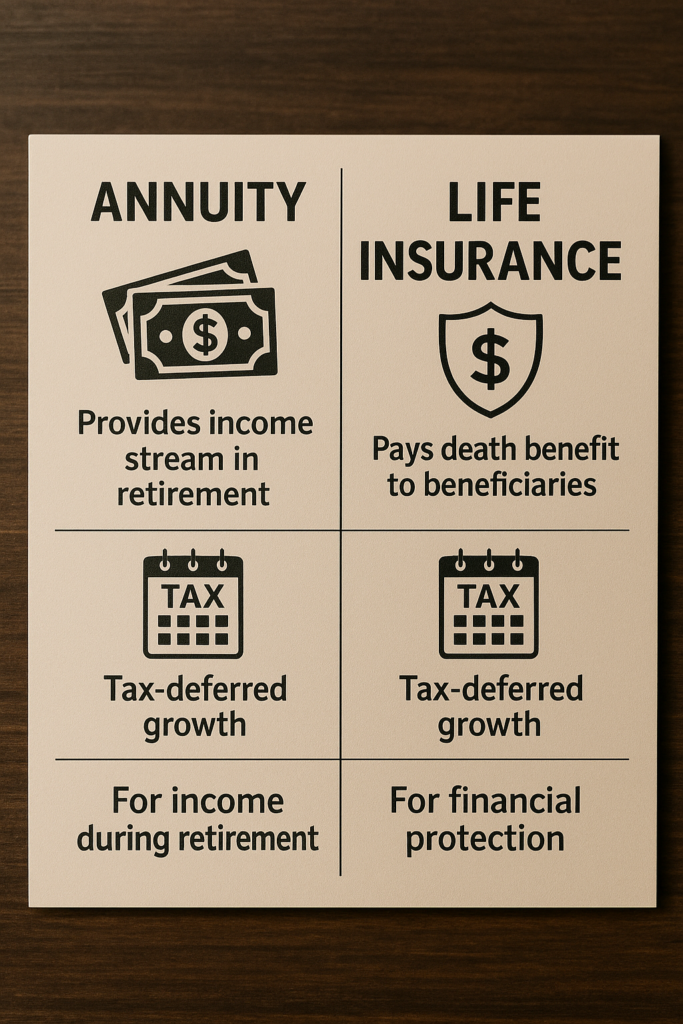 Both tools offer tax advantages but in different ways. Life insurance cash value grows tax deferred, and death benefits are generally paid tax free to beneficiaries. By comparison, annuities also grow tax deferred, but withdrawals are taxed as ordinary income upon distribution.